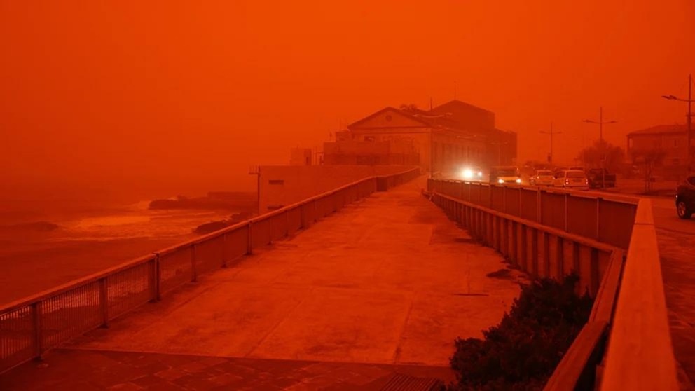 Сильные южные ветры принесли огромные массы песка из Сахары на греческие острова. Небо над Критом, Санторини, Наксосом и Миконосом окрасилось в оранжево-красный цвет, видимость резко упала — днём автомобили ездят с включёнными фарами.